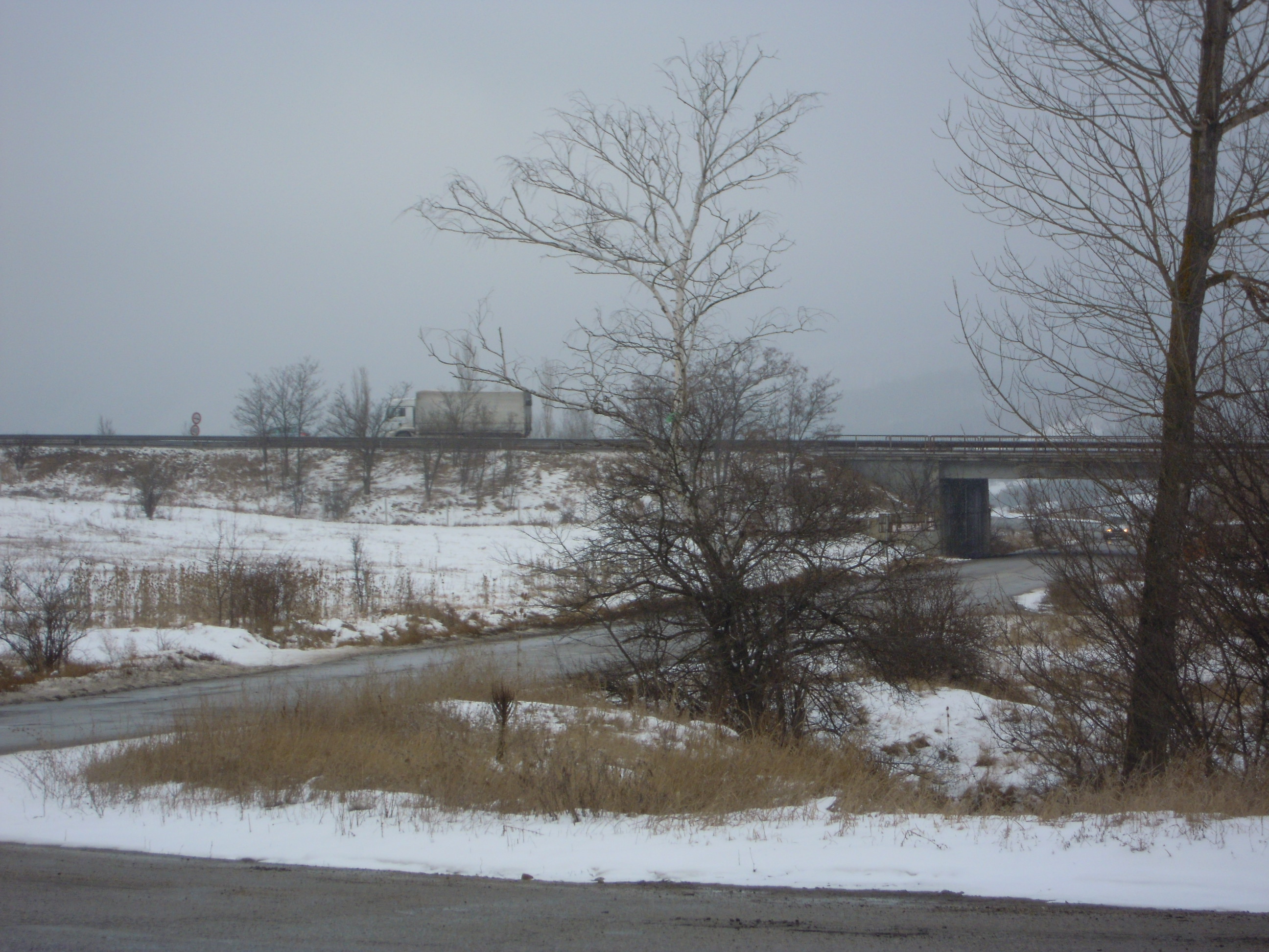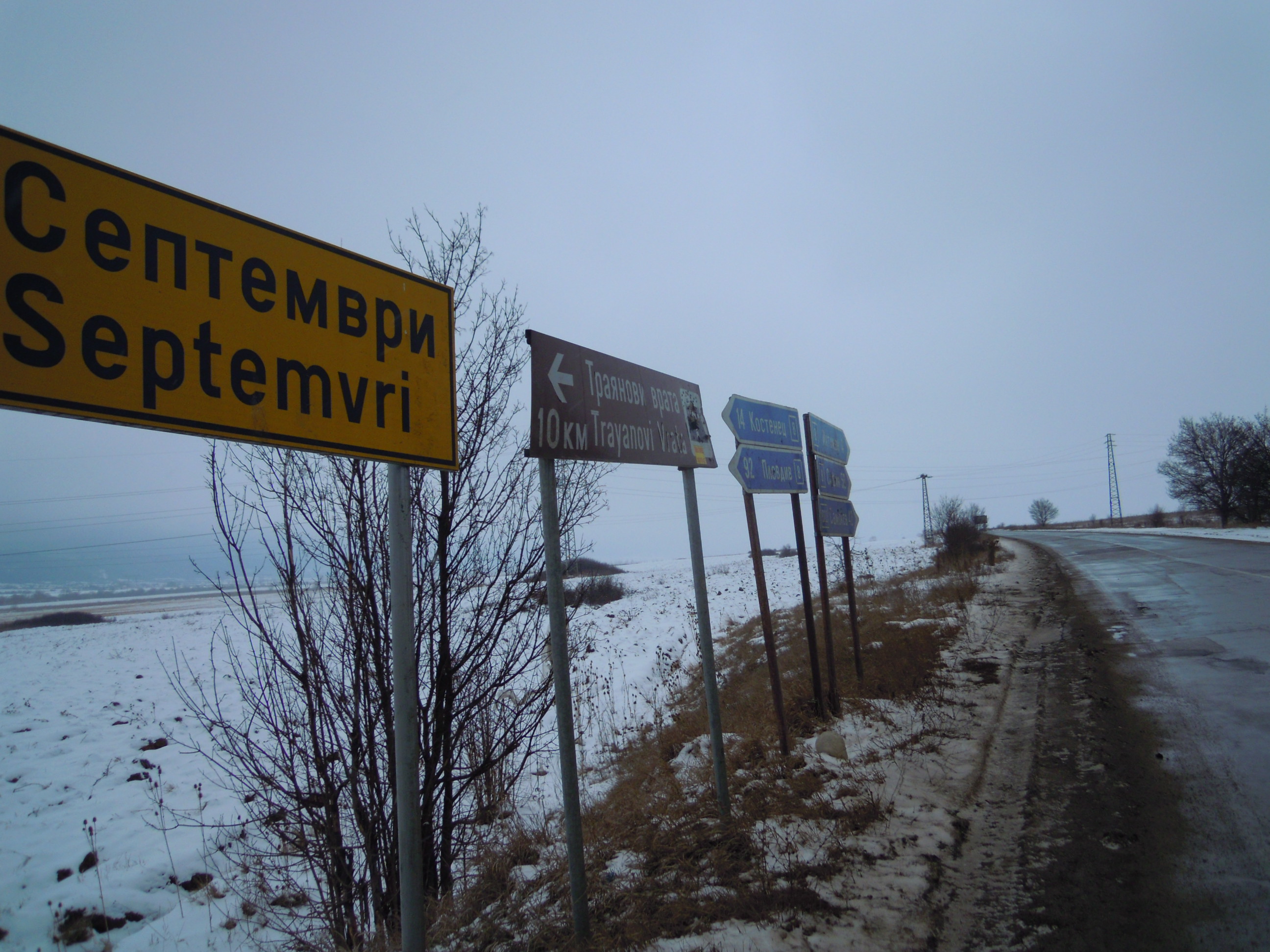 J’ai pinaillé pendant un moment pour arrêter une voiture alors que je demandais juste Kostenets qui est à quatorze putain de kilomètre !! Temps long et vraiment pourri, plafond bas, vent froid et petite neige, la route était gadoueuse et quand un camion passait je me faisais crépir de boue. Pas terrible, j’ai attendu très longtemps là.. J’aurai presque pu les faires en courant, sans les sacs.