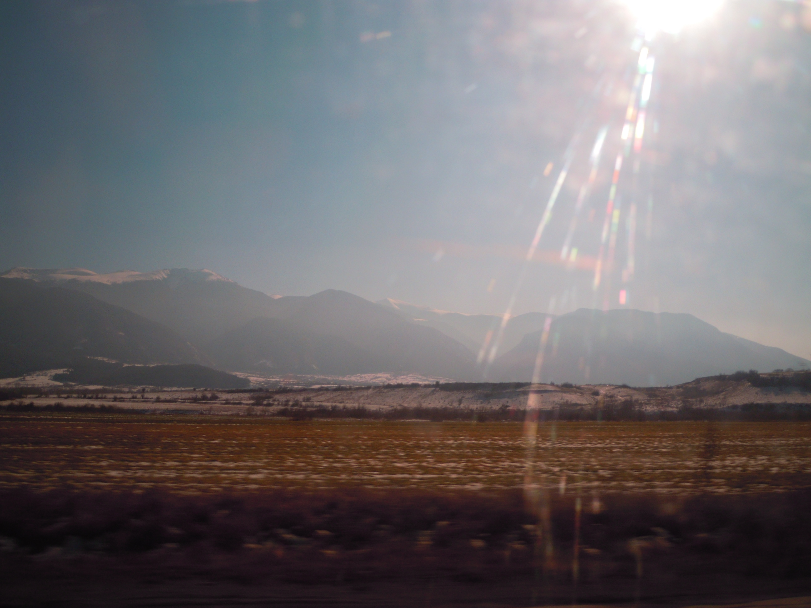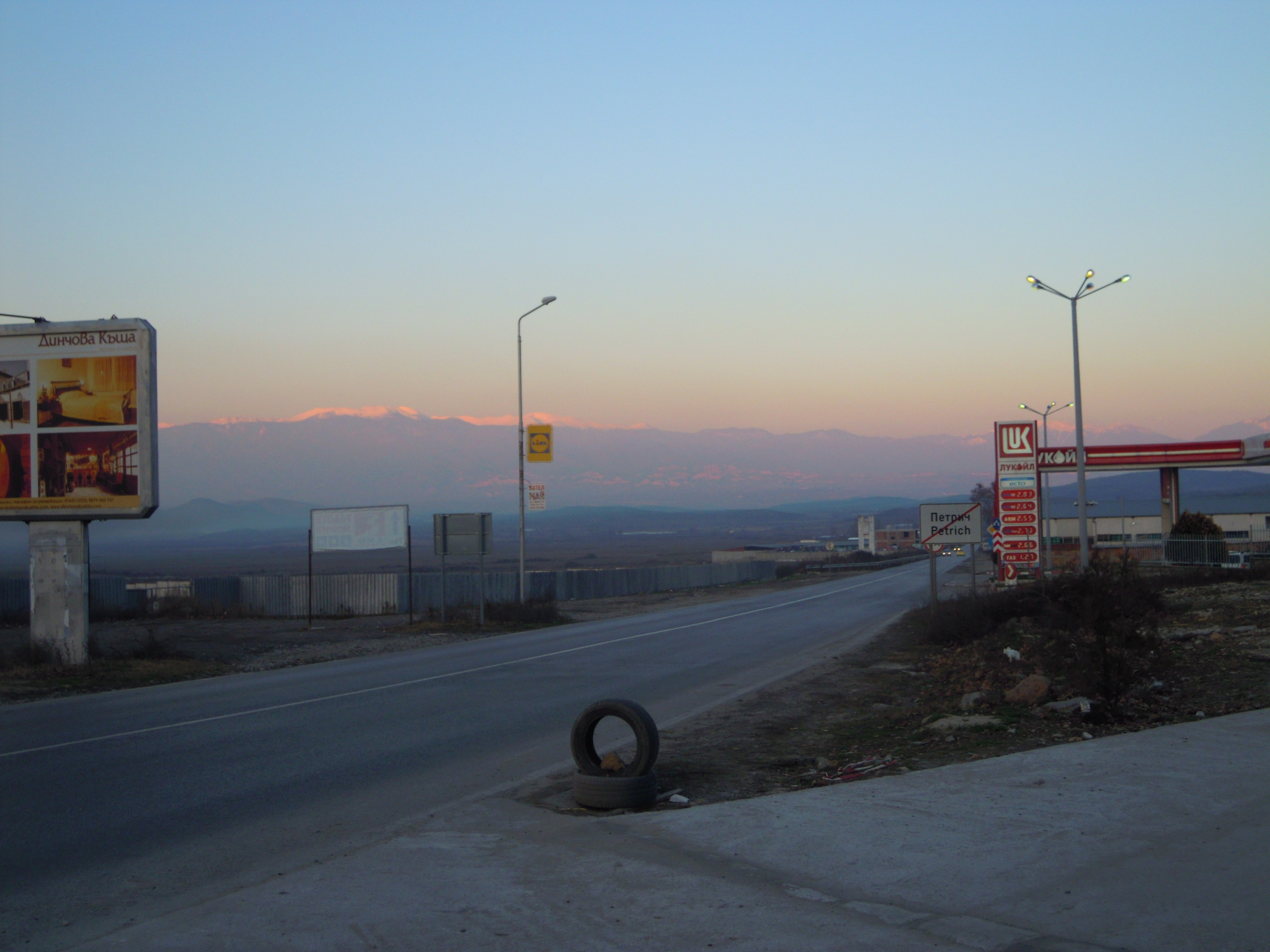 La région est vraiment montagneuse et autant à borovets dans le brouillard et le froid j’avais aucune envie de skier, autant la, le pouce levé comme un con dans une vallée entourée de hautes montagnes blanches, démangeaisons. Le camionneur qui m’a payé sa génoise avait l’air sympa, un vieux les dents vraiment démontées par le tabac, pas d’anglais, quelques gestes et je me suis assoupis un quart d’heure.On est arrivé à Petrich, le bout de la Bulgarie vraiment ghetto. Des maisons en ruine de partout, une famille de roms qui faisait du feu dans un trou dans le goudron en me regardant mal, des calèches et des Audi et le soleil se couchait sur les monts enneigés. Je suis allé taper aux fenêtres des voitures avec une plaque grecque et deux papys vraiment vieux ont accepté de me prendre.