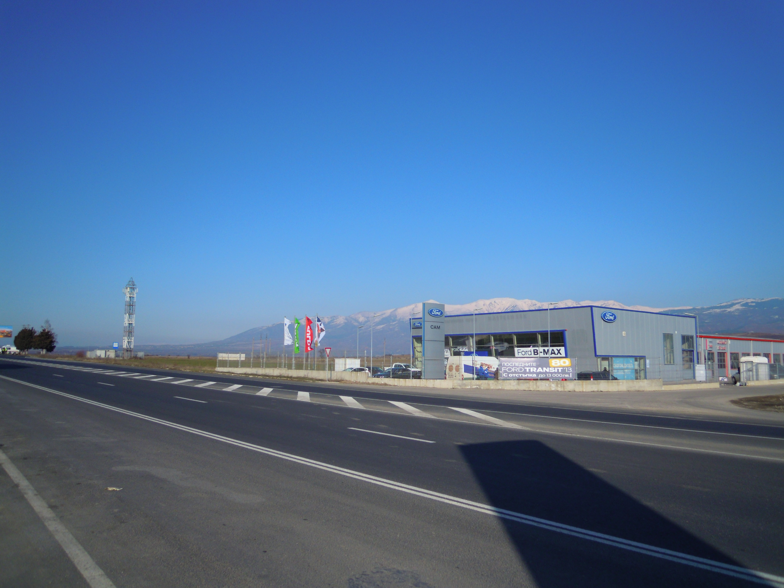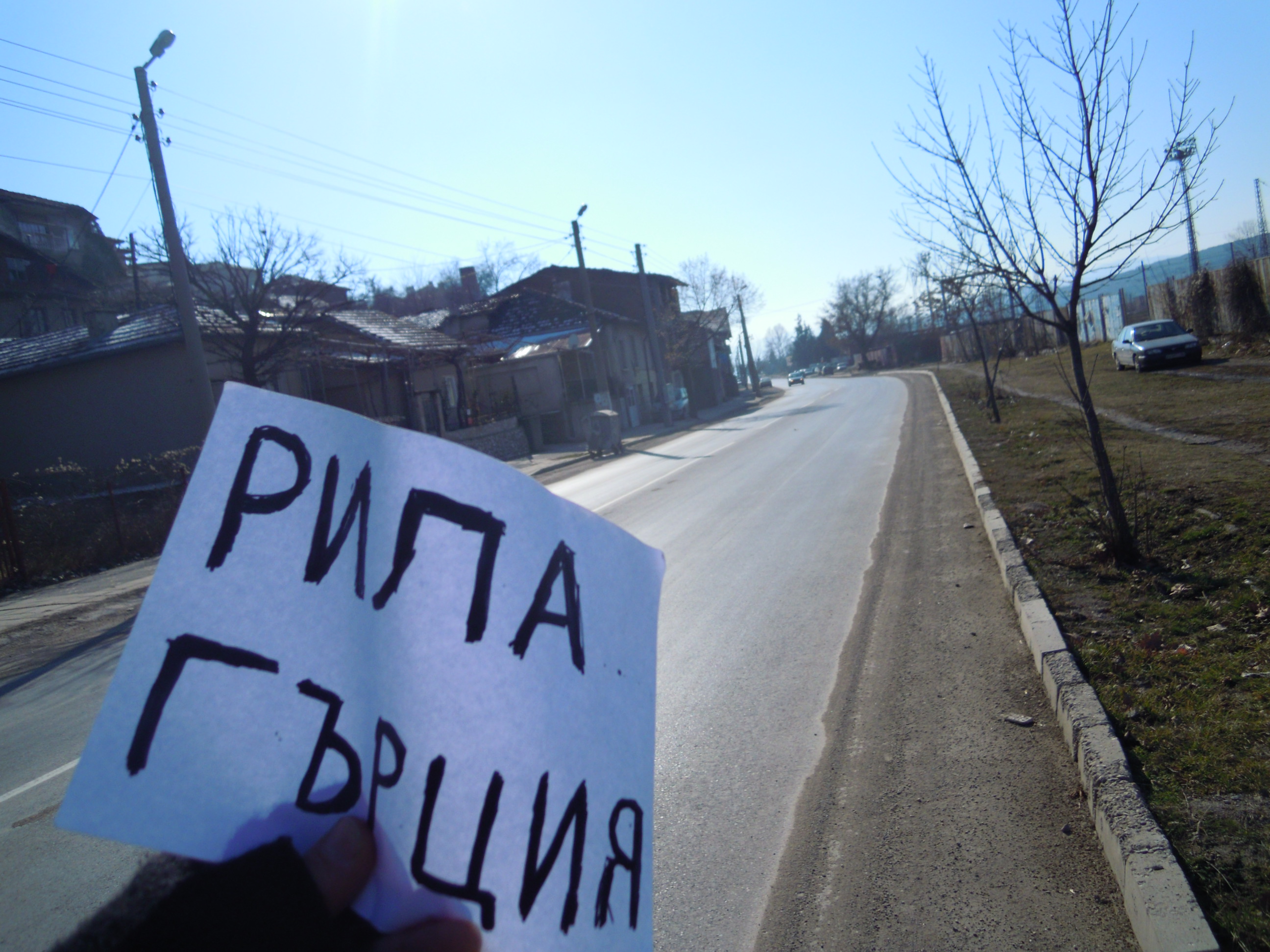 Deux jeunes sans un seul mot d’anglais m’ont amené jusqu’à Dupnica et les nuages se sont enfuit d’un coup ! Le conducteur m’a passé son phone à un moment avec quelqu’un qui parlait que bulgare au bout du fil, ça le faisait marrer. J’ai rappé quelque phrases de la Caution mais le mec disait rien du tout. Ils m’ont laissé en centre-ville croyant que c’était ma destination principale. Pas mal marché jusqu’au sud de la ville, profité du soleil qui m’avait manqué. Acheté un paquet de Lays crème/champignon à une station-service et poucé à coté de flics au bord de la voie rapide.