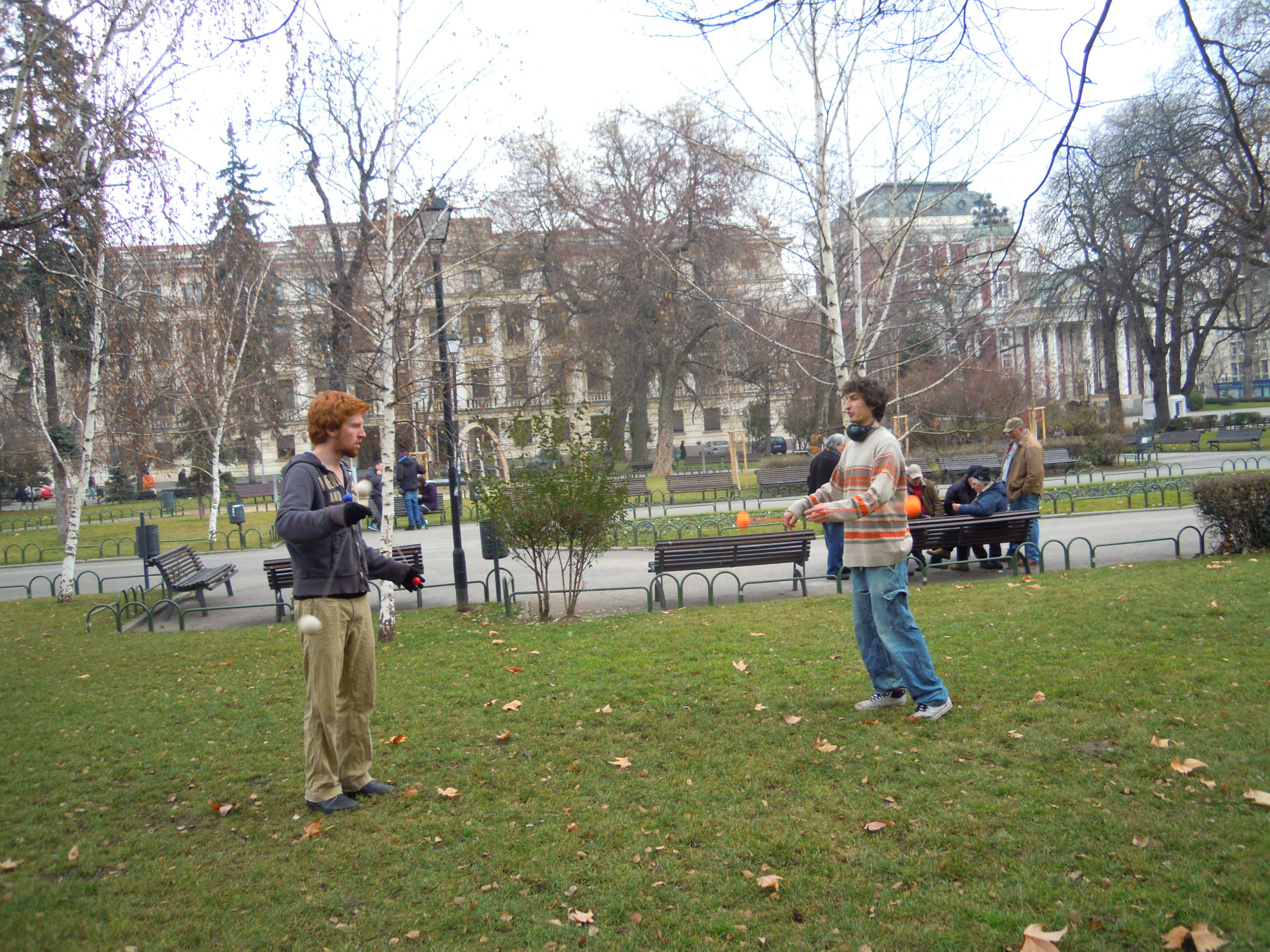 On est allé dans un des nombreux petits parcs du centre a côté d'un théâtre ou il m'a appris les techniques de base de la jongle content d'apprendre quelque chose. Ils se déplaçait jamais sans don atelier de jonglerie. Le temps était encore doux et cela continuait à étonner.